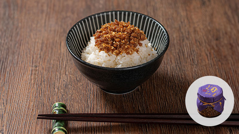 真骨頂である脂のうまさを活かしつつ甘辛く味付けしており、食べやすいそぼろ状になっているため、ご飯にさっと振りかけていただくだけで旨味を味わうことができます。アクセントに生姜やゴマも入っており、さらに食欲を引き立てる逸品です。